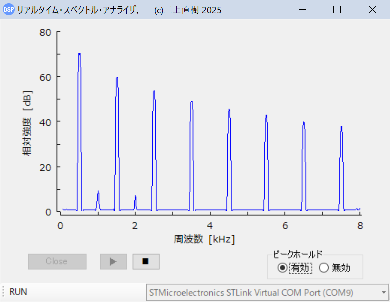 セミナで作るクラスを組み合わせて作ったスペクトラム・アナライザの処理結果をPCに転送して表示している様子(500 Hzの方形波をAD変換器に入力した場合)